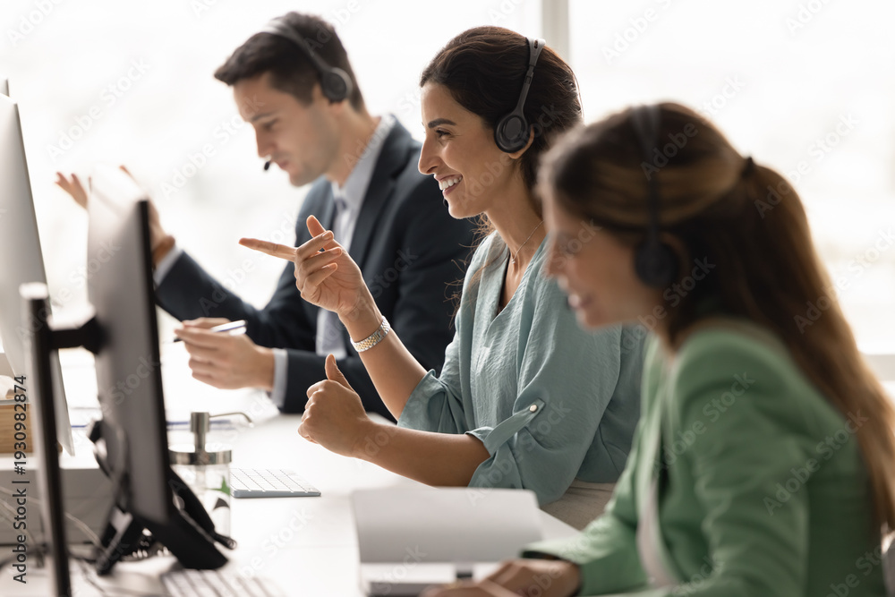 • Diverse customer care team sitting at desk in headsets communicating online via computers managing client relationships handling inquiries providing professional friendly service in call centre office