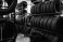 Pejzaże - Stacked black rubber tires on metal racks inside a tire shop with bright lighting and spacious... #1935518900