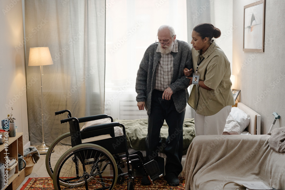Pejzaże - Black woman social worker assisting senior Caucasian man with disability standing up from bed in... #1936626900