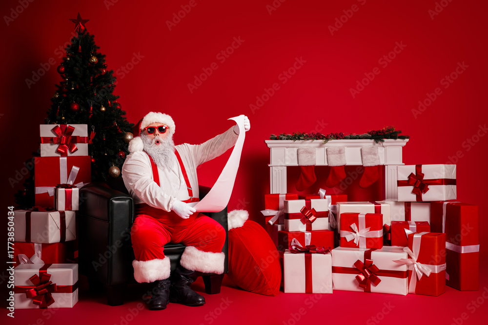Sport - Santa reads a long list among gifts beside a Christmas tree against a bold red backdrop with... #1773850434