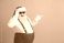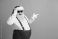 • Santa Claus in red suspenders and white coat smiles and points on a pink background for a playful festive Christmas mood