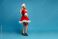 • Cheerful woman in red Santa dress with fur trim posing on blue studio backdrop for Christmas fashion and festive celebration