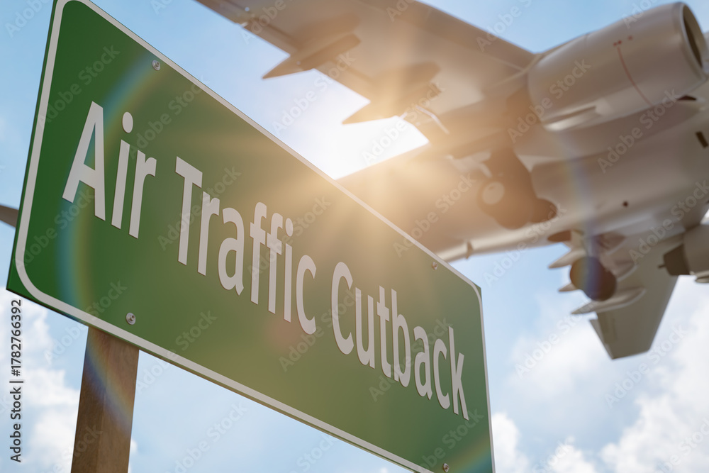 • Air Traffic Cutback Green Road Sign with Airplane Above.