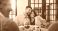 • Celebration, Christmas and hug with couple in dining room of home together for family gathering. Food, holiday tradition and love with happy people at table for banquet, dinner or festive feast