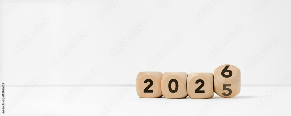 • Wooden blocks transitioning from 2025 to 2026 on a clean white background. Concepts of a new year beginning, goal setting, planning, transition, change, and future opportunities.
