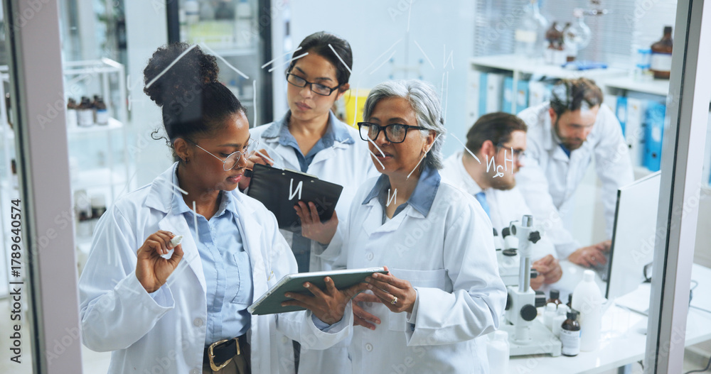 Sport - Tablet, formula and writing with people in lab for chemical structure, medical drug trail and... #1789640574