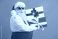 Sport - Santa Claus in red suit with white gloves carrying stacked gift boxes against a blue background... #1790760391