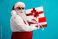 • Santa Claus in red suit with white gloves carrying stacked gift boxes against a blue background for christmas shopping and holiday season stock photo