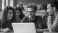 • Four young diverse students laugh while looking at laptop screen in university lecture hall. Friends collaborate on academic project with modern tech during class time. Education and learning.