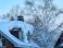 • CLOSE UP: A thick blanket of icy snow covers the roof of a suburban red brick house on a cold winter day in Niseko, Japan. Snow-laden roof arcs over windows, with birch trees fully covered in snow.