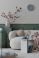 • Creative composition of spring living room interior with boucle sofa, stylish coffee table, green stand, glass vase with flowering branches and personal accessories. Home decor. Template.