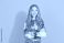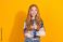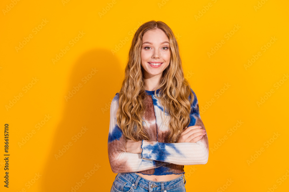 • Young woman with long blonde hair wearing tie dye top and jeans stands against a bright yellow background smiling for a fashion lifestyle image