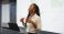 • Presentation, public speaking or black woman with laptop at podium, company stats or performance data review. Business seminar, pc or worker with info analysis, charts or graphs for growth discussion