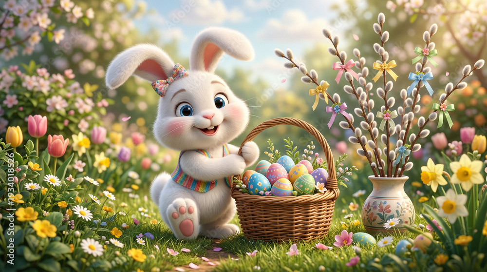 Bajki - Puchaty króliczek wielkanocny z koszem pisanek i baziami w wazonie #1934018526