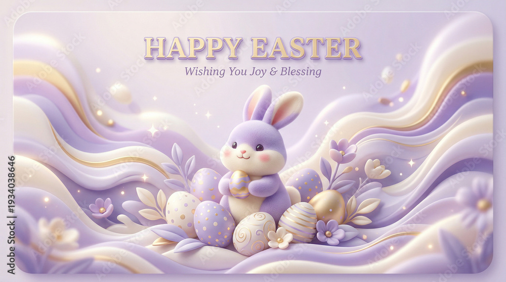 • Życzenia Wielkanocne na pięknej kartce z wizerunkiem króliczka wielkanocnego i pisanek. Całość ilustracji utrzymana w kolorach fioletu i jasnego beżu.