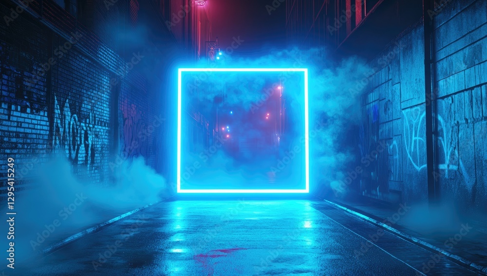 Street Art - A glowing blue neon square frame in the center of an empty, dark street with fog and graffiti,... #1295415249
