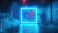 • A glowing blue neon square frame in the center of an empty, dark street with fog and graffiti, creating a mysterious atmosphere. The background features tall buildings and city lights in silhouette.