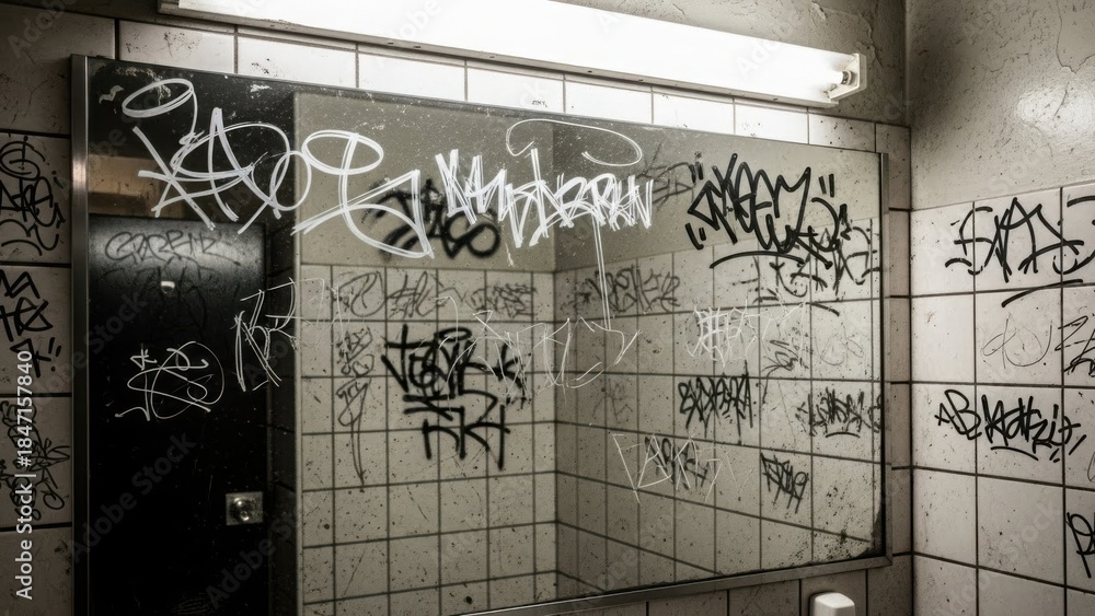 • A dirty public bathroom mirror covered in graffiti tags. Urban vandalism and decay in a grungy restroom. Gritty street art background