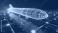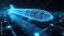 • Blue glowing wireframe missile model represents advanced digital tech design. Futuristic weapon structure shows complex engineering data. Cyber military concept on dark circuit background visualizes