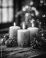 • three glowing advent candles on rustic wooden table with pine and bokeh