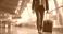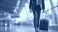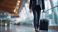 • Faceless businessman in crisp charcoal suit walking purposefully through expansive airport terminal defocused architectural background polished rolling suitcase trailing behind