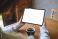 • Mockup image of a woman holding digital tablet with blank white desktop screen in cafe