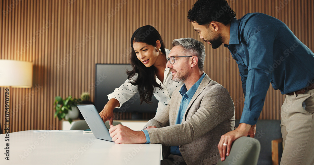 Pejzaże - Laptop, meeting and manager with business people in office for finance report with budget plan.... #1874978726
