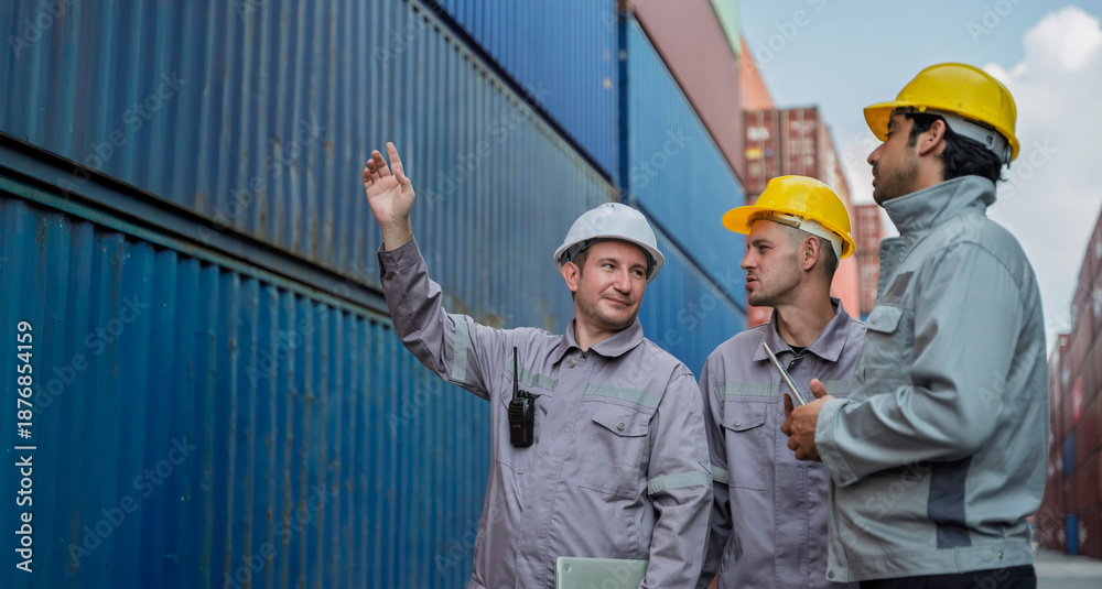• Team of professional logistic engineers inspecting shipping containers at a busy cargo port. Men pointing and discussing global export business plans using a digital tablet technology.