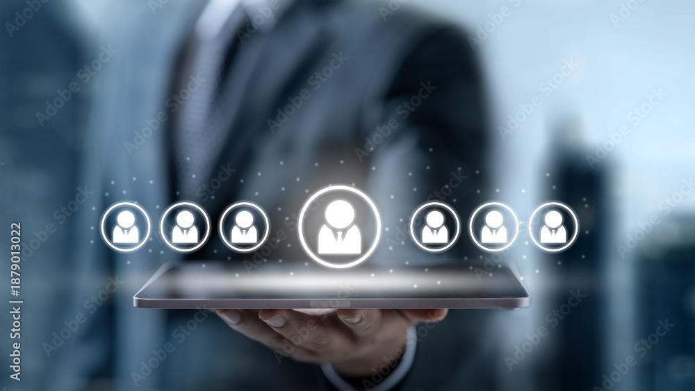 • Businessman holding a tablet with digital people icons, symbolizing HR management, recruitment, and talent selection in a modern corporate environment