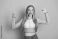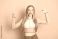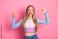• Charming girl posing with confidence and a happy expression, wearing trendy casual fashion on a pink background