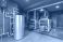 • Two large boilers sit side by side in a utility room. A metal storage tank stands nearby. Pipes run along the walls and connect the equipment. The room is well-lit and features gray tiles