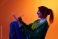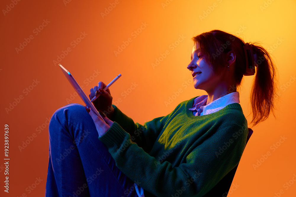 • Young woman drawing on tablet with stylus in studio with vibrant gradient lighting. Concept of digital illustration work, creative freelance process and modern content production.