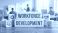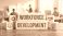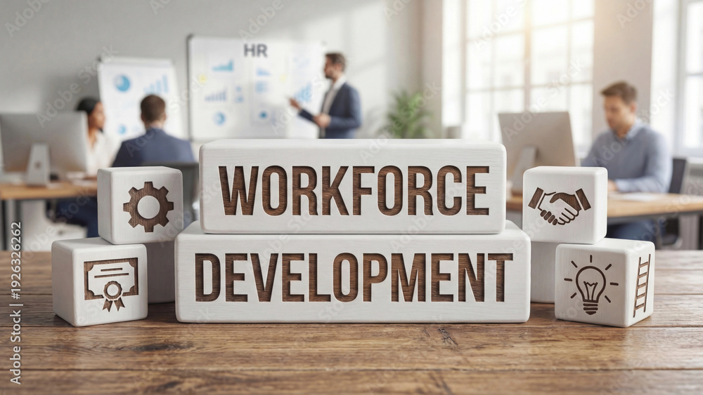 • Workforce Development engraved wooden blocks with gear handshake certificate and lightbulb icons in HR training office environment for employee skill growth and organizational learning