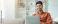 • A man sits on a couch working on a laptop. He smiles while looking at the screen. A bright room with shelves and books is in the background. Natural light fills the space.