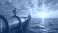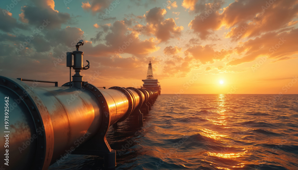 Pejzaże - Offshore industrial pipeline for hydrogen transport crosses ocean water at sunset. Metal... #1978925662