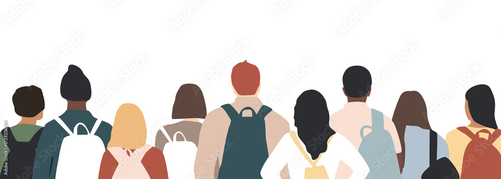 Owoce - Different people with backpacks. Back view background. #1739206199