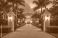 • Opulent mansion entrance with grand driveway, ornate gates, and lush palm trees. Elegant estate features illuminated pathway leading to large mansion exterior. Exclusive luxury residence.