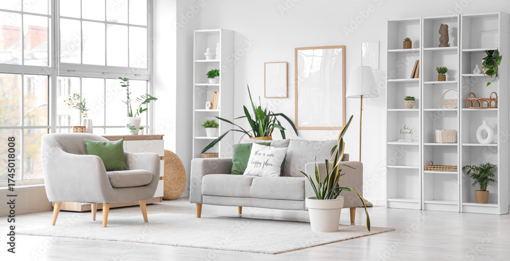 Owoce - Interior of light living room with grey sofa, armchair and green plants #1745018008