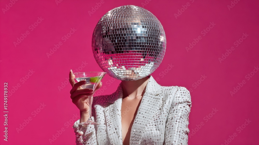 • Disco ball head fashionista in sequined blazer holding cocktail against pink backdrop