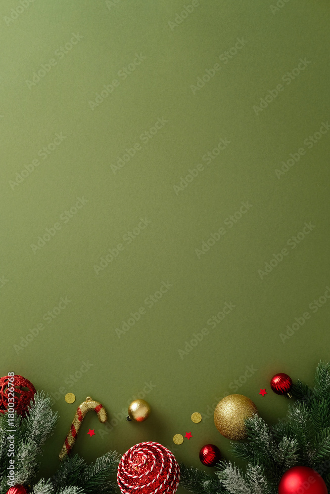 • Elegant bottom border of Christmas decorations: snowy fir branches, glittery baubles, a candy cane, and confetti on a vertical green background