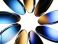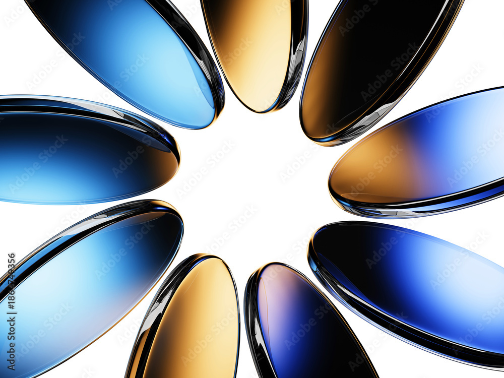 • Neon glass round frame, geometric vibrant flower of transparent circle discs on black 3d background. Abstract crystal floral pattern with gold blue gradient and circular motion effect