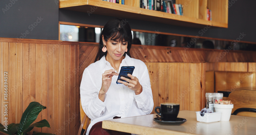 Owoce - Business woman, phone and reading in coffee shop for break, social media and notification.... #1866894572