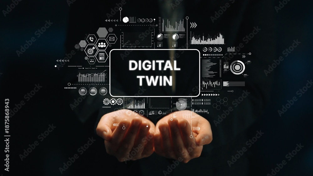 Owoce - Businessperson Presenting Concept of Digital Twin Technology with Data Visualization Elements in... #1875868943