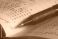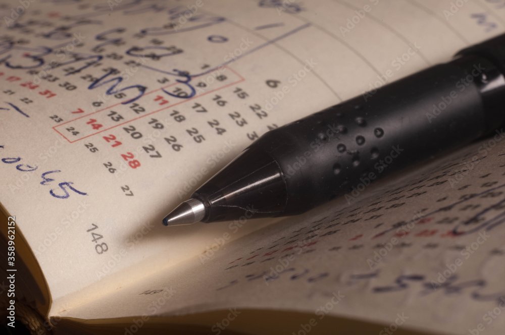 • Pobazgrany notatnik z leżącymi na nim biurowymi przyborami