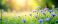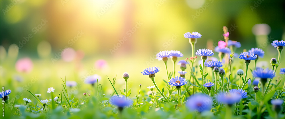 • Kwitnące niebieskie i różowe kwiaty na rozświetlonej słońcem łące