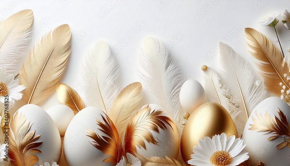 • Wielkanocne tło z białymi i złotymi pisankami, kwiatami i piórami