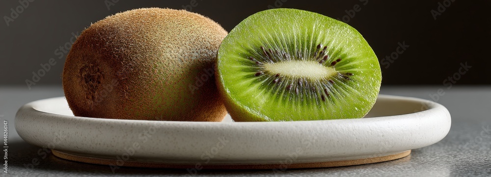 • Vibrant kiwi fruit showcases lush green interior on a simple white plate