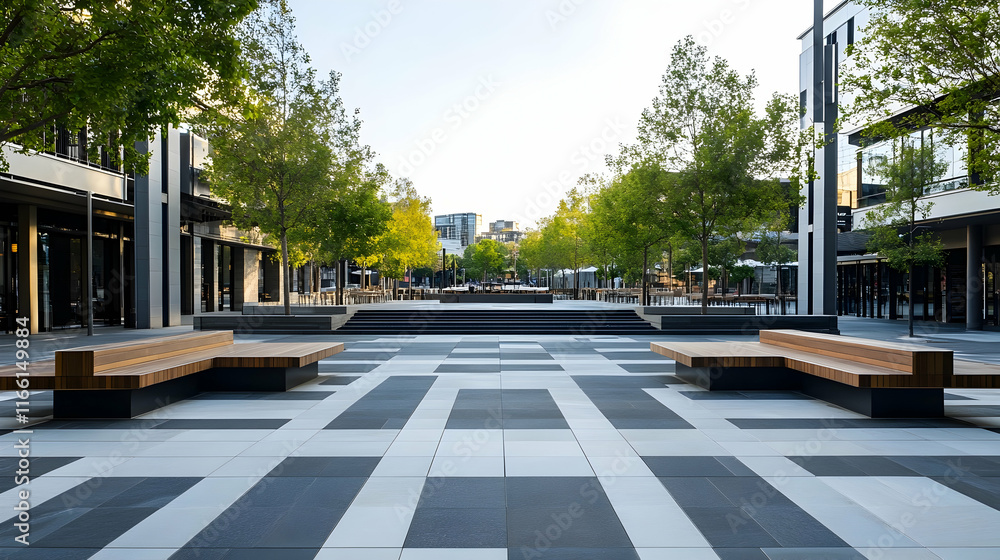 Panel Szklany do Łazienki - Melbourne minimalist urban plaza with open seating and geometric paving modern design #1166149884