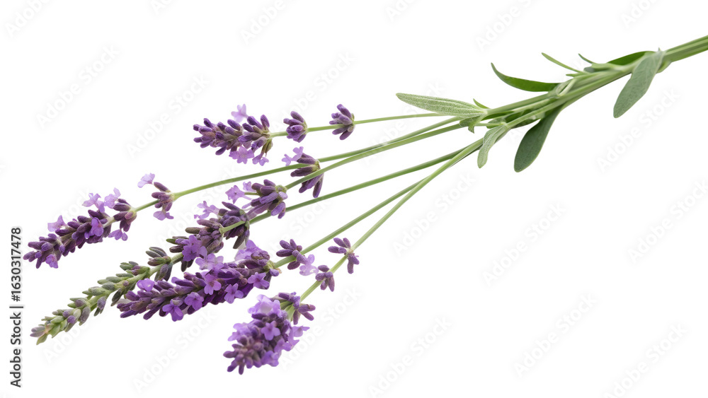 • Sprig of fresh purple lavender flowers with green leaves, isolated on transparent background