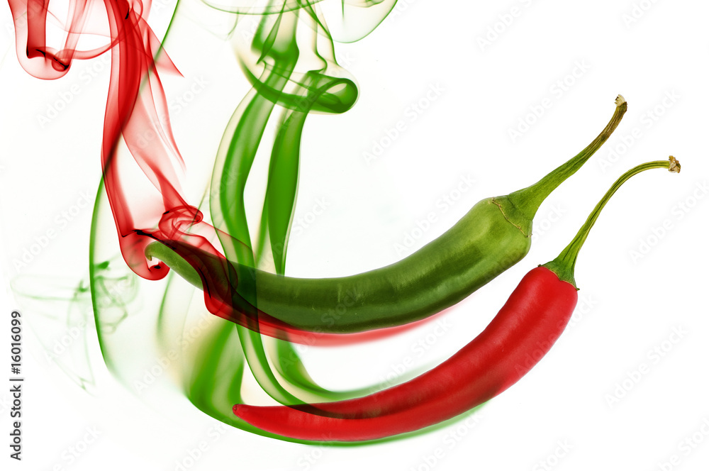 Najpopularniejsze - red and green hot chili pepper with color smoke on white #16016099
